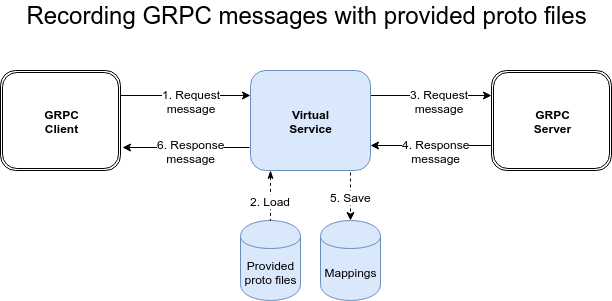 As you can see in the diagram below, the virtual service acts as a proxy between the gRPC client and gRPC server. The provided proto files are used to determine the message schema of the request and response messages for the requested gRPC method. Mappings are saved representing request/response pairs that have been recorded.