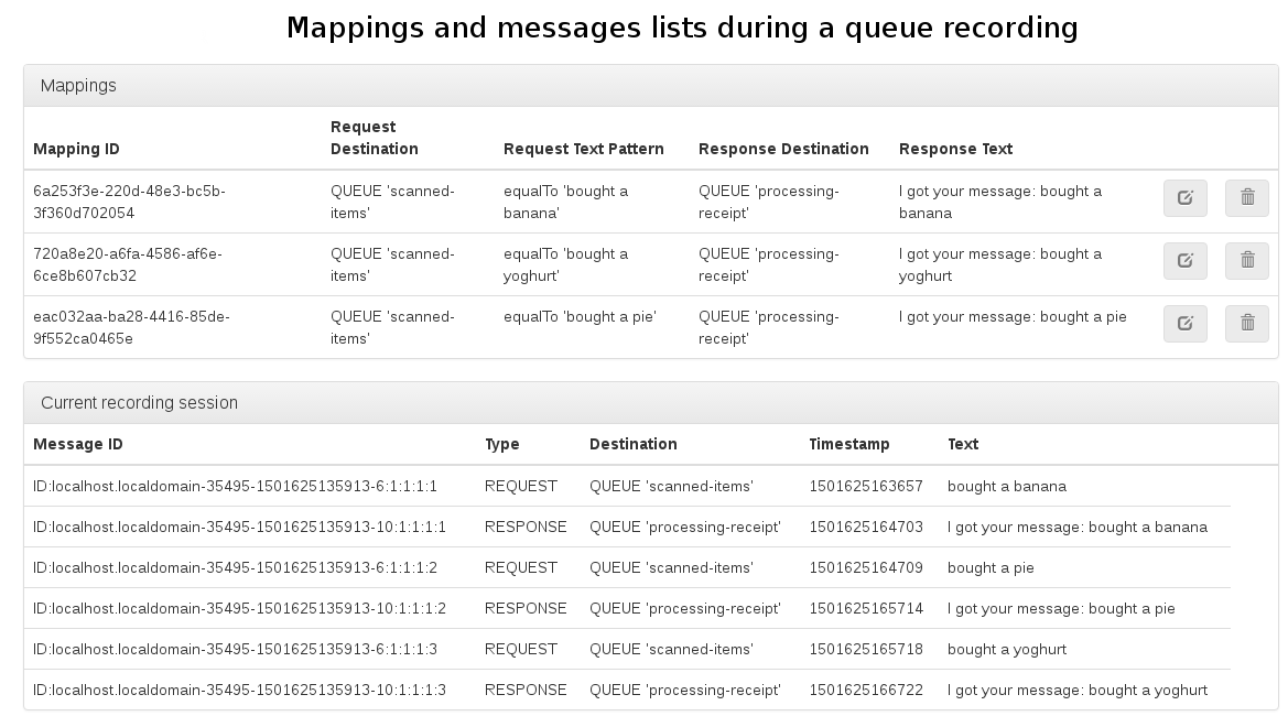 As the system-under-test generates messages they are listed in the bottom table 'Current recording session'. As the second system generates responses to these messages, they are also listed at the bottom, but in addition mappings are generated in the 'Mappings' table showing incoming and outgoing messages that Traffic Parrot has paired up.