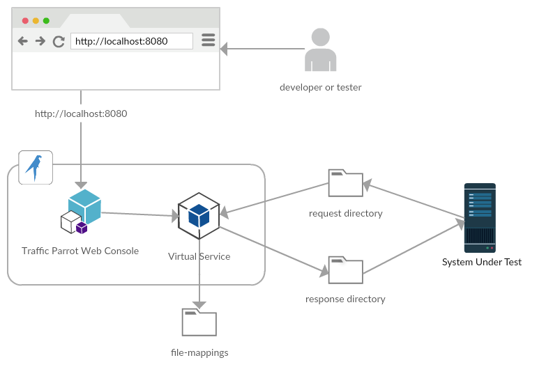 A tester or developer uses a web browser to access the console. The console manages the virtual service. The system under test (application under test) connects directly to the virtual service on different ports.